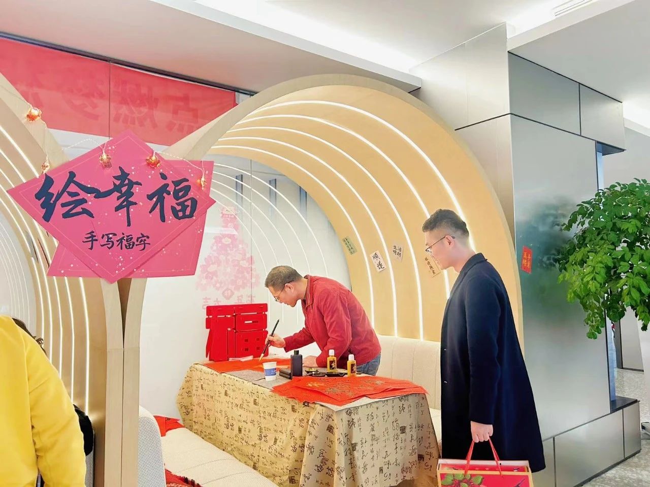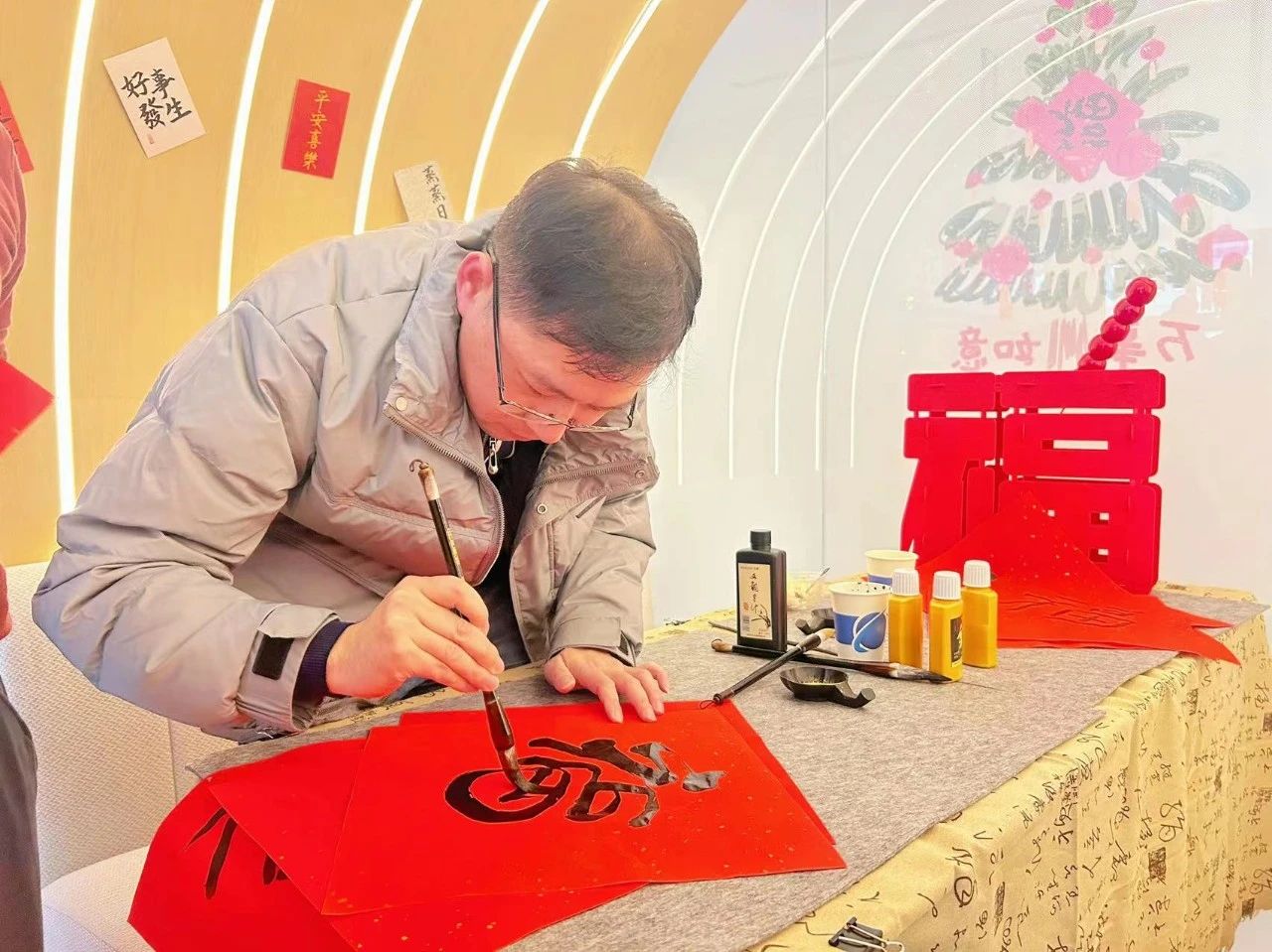 “心中有丘壑,筆墨作山河”,大家在鋪開(kāi)的春聯(lián)紙上,寫下蒼勁有力、瀟灑自如的福字,將濃濃的情誼、真誠(chéng)的祝福,傾注于字里行間。
