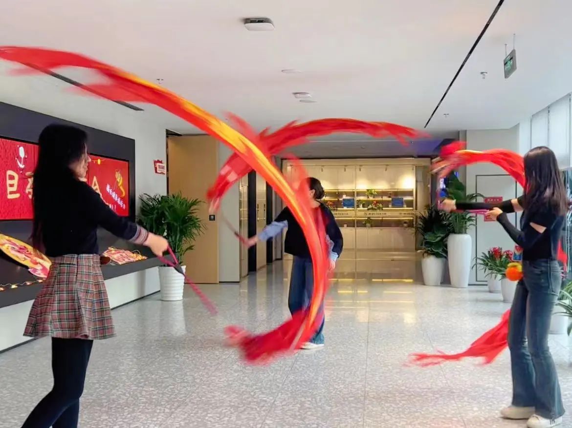 同事們有力地?fù)]動(dòng)手中的短繩,龍頭彩帶飄逸靈動(dòng),讓一條條“游龍”在空中飛舞。