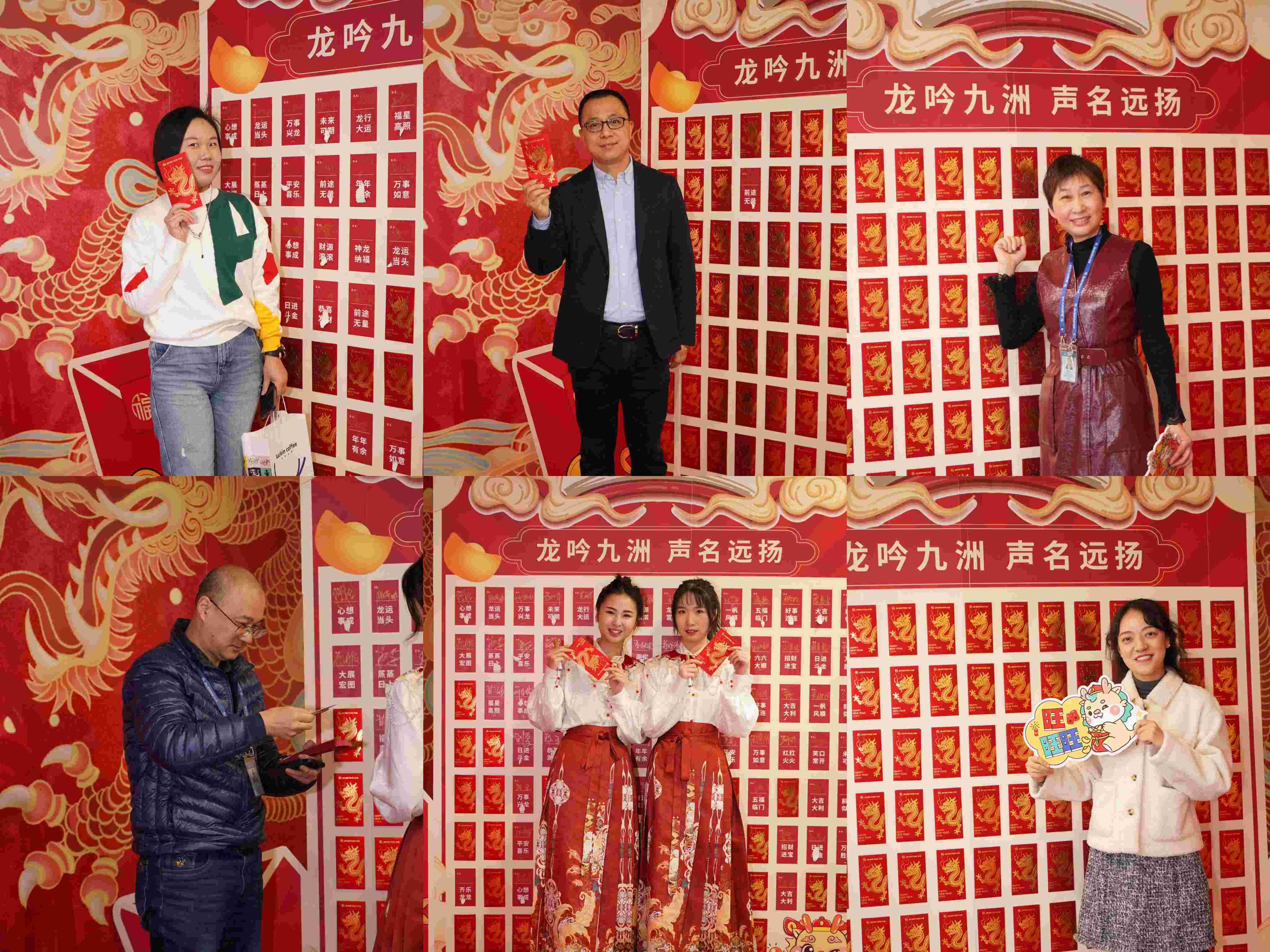除了伴手禮外,公司還設(shè)置了紅包簽到墻,紅包內(nèi)有不同的“小驚喜”,抽取紅包后,龍年相關(guān)祝福語映入眼簾,大家紛紛簽名寄語,祝愿公司蒸蒸日上,家庭幸福安康!